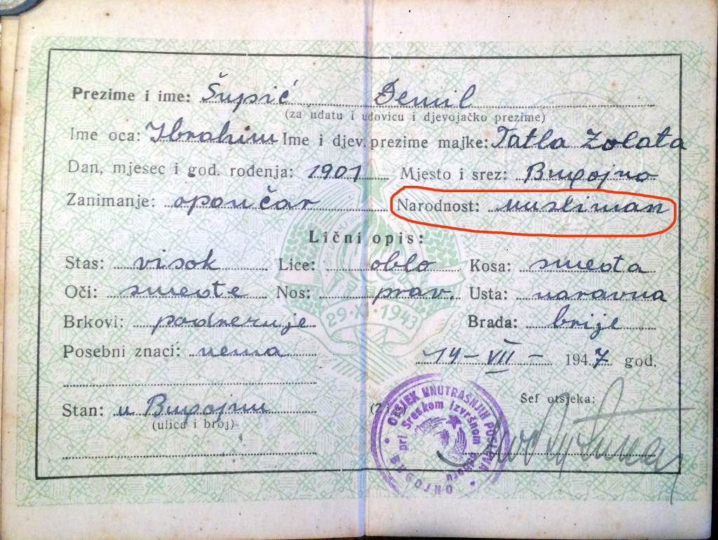 Bosanski muslimanski subjekt o tome ne vodi računa kada sklapa svoju »bošnjačku naraciju«, što se uglavnom svodi na gomilanje iskaza koji je prema njegovom uvjerenju potkrepljuju. Tačnije rečeno, on nikada neće odbaciti stavove koji su opovrgnuti, već će prešućivati elemente koji ih opovrgavaju. To možemo pokazati na primjeru opšteraširenog uvjerenja da su komunističke vlasti nakon Drugog svjetskog rata sprečavale nacionalno izjašnjavanje Muslimana kao Muslimana. Politički su oni možda i bili priznati, kaže mit, jer se spominju u odlukama ZAVNOBiH-a, u različitim proglasima stanovništvu u vrijeme NOB itd., ali su administrativno, u ličnim dokumentima, morali da se izjasne kao Srbi ili Hrvati, ili da ostanu »neopredijeljeni«. Stoga s izuzetnim zadovoljstvom donosim presliku legitimacije Šupić Đemila, sina Ibrahimovog i opančara po zanimanju, koji se još 1947. izjasnio kao Musliman po narodnosti, a brkati udbaš u Otsjeku unutrašnjih poslova pri Sreskom izvršnom odboru u Bugojnu, posljednjoj od svih bosanskih vukojebina nakon Sanskog Mosta, nije ga u tome spriječio već je podatak uredno unio u evidenciju i u lični dokument.