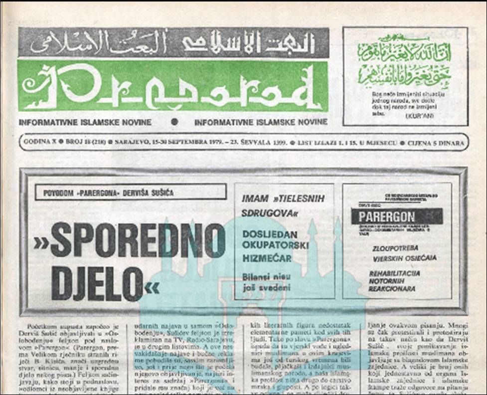 Sušić … je na izričito političkoj ravni pristupio kako pojedinim muslimanskim građanskim političarima tako i ličnostima iz vođstva Islamske zajednice i ilmije u periodu između dva rata i vremenu ratnih godina. Strpavši ih u istu vreću, on im je zajedno presudio po veoma kratkom postupku kao pljačkašima i izdajnicima vlastitog naroda. Ovu ocjenu o vjerskom vodstvu muslimana u kasnijim nastavcima on proširuje sve do davnog turskog vakta i, izuzimajući iz nje samo Džemaludina Čauševića, pridodaje joj bez nekih literarnih figura nedostatak elementarne pameti kod svih tih ljudi. Tako po slovu »Parergona« ispada da su vjerski vođe i uglednici muslimana u ovim krajevima još od turskog vremena bili budale, pljačkaši i izdajnici muslimanskog naroda, a naša islamska prošlost ništa drugo do carstvo mraka i gluposti[27].