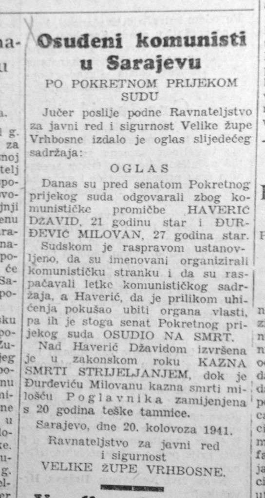 Nad Haverić Džavidom izvršena je u zakonskom roku KAZNA SMRTI STRIJELJANJEM, dok je Đurđeviću Milovanu kazna smrti milošću P o g l a v n i k a zamijenjena s 20 godina teške tamnice.